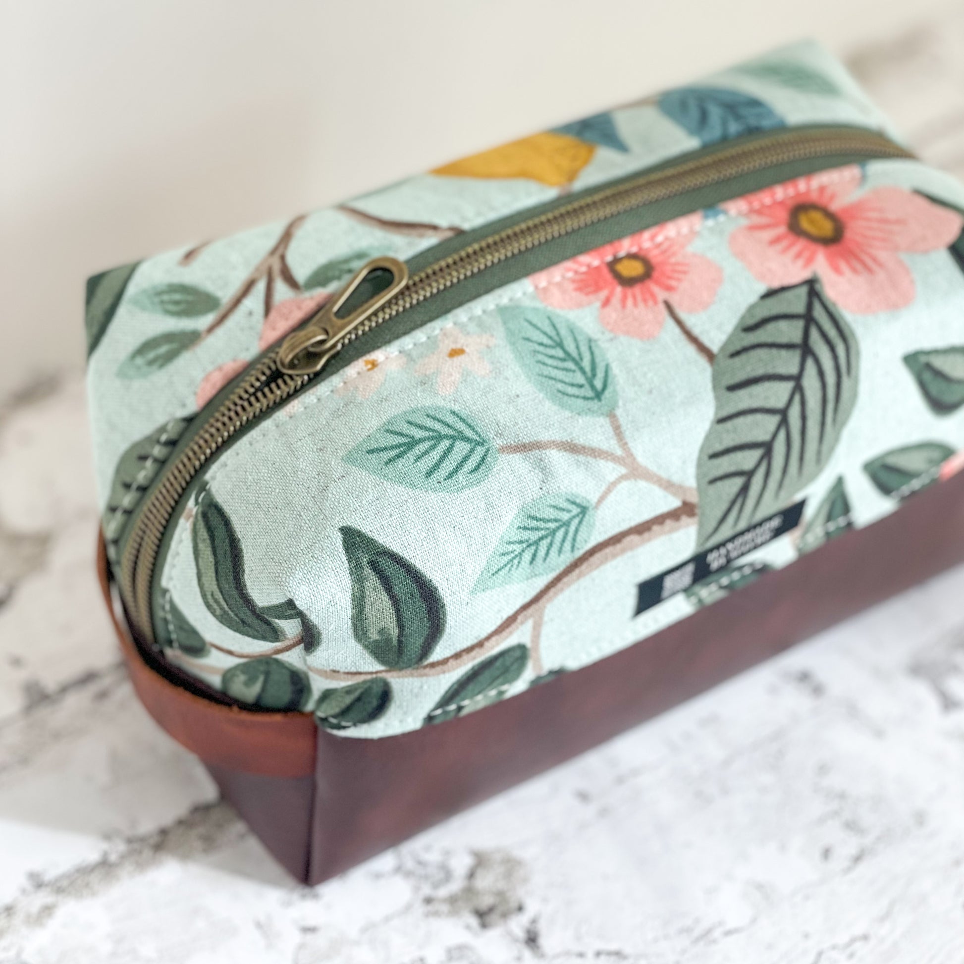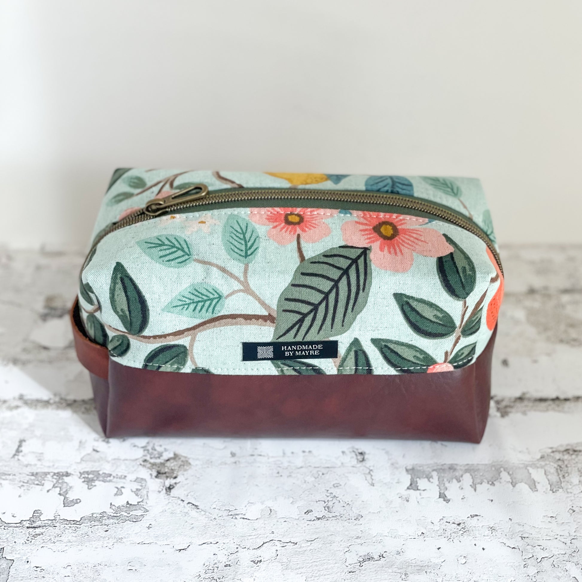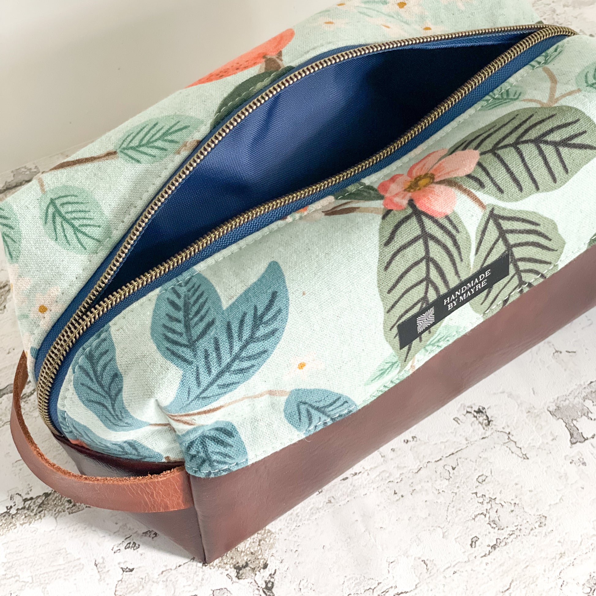 Crafted with durable cotton canvas, a vinyl bottom and a waterproof canvas interior, the boxy pouch serves as a versatile everyday makeup bag or travel toiletry bag. These handmade pouches have a roomy interior and by flipping the top out you can have great access to all your essentials.