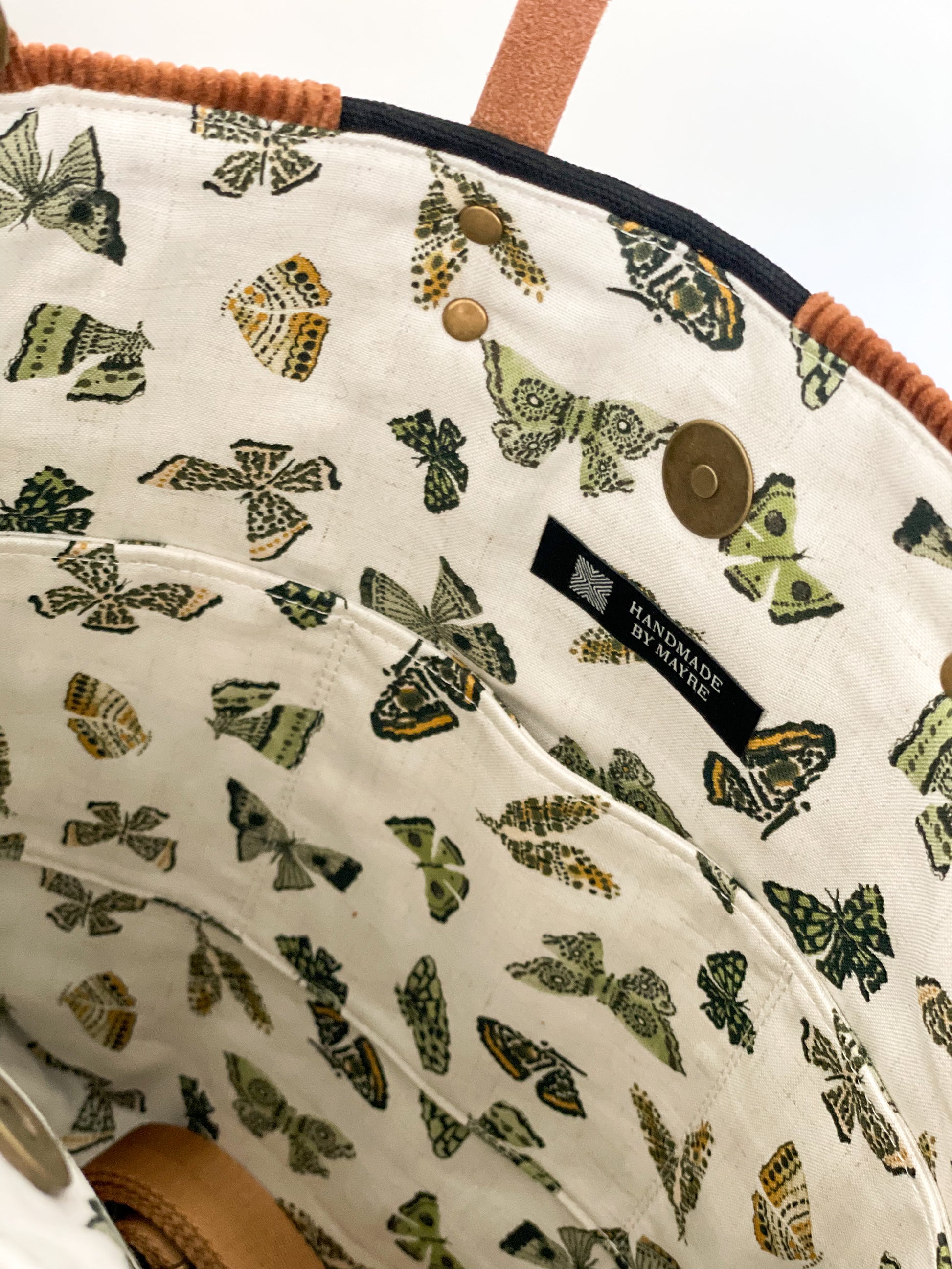 This is a dual sided bag. One side is black and caramel corduroy and the other side with a zipper is white and caramel corduroy.